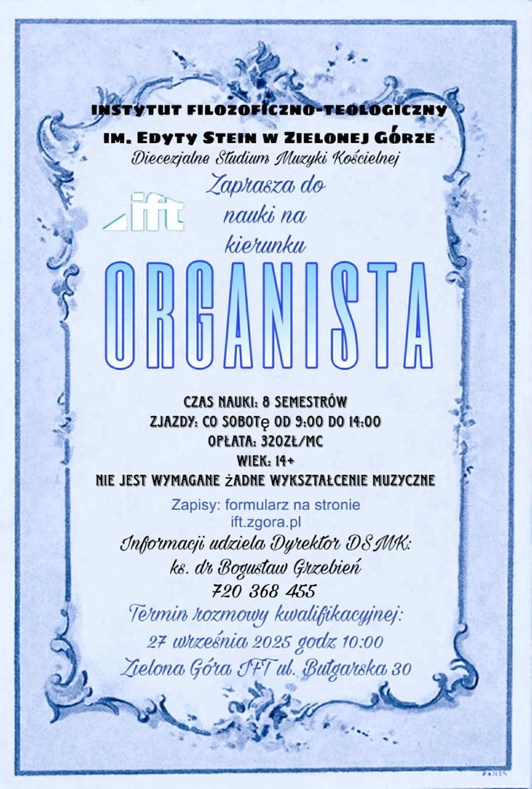 Kierunek ten jest dedykowany osobom, które chcą zostać organistą, nauczyć się akompaniamentu liturgicznego oraz grania utworów z bogatego zbioru literatury organowej. Kierunek "Organista" daje także kompleksowe wykształcenie do pełnienia funkcji animatora życia muzycznego w parafii. Absolwenci tego kierunku z powodzeniem zdają egzaminy na uczelnie muzyczne. Nie jest wymagane wykształcenie muzyczne, uczymy od podstaw. Osoby posiadające wykształcenie, bądź będące w trakcie kształcenia muzycznego mogą zacząć naukę od II roku. Ostateczna decyzja w tej sprawie należy do Dyrektora Studium.
